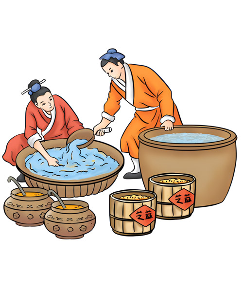 - 漂洗后的芝麻,以鐵鍋碳火慢炒至香味溢出。其中炒芝麻的手法、火候及加料工藝等,都以獨(dú)特的秘訣形式由師徒間代代傳承。